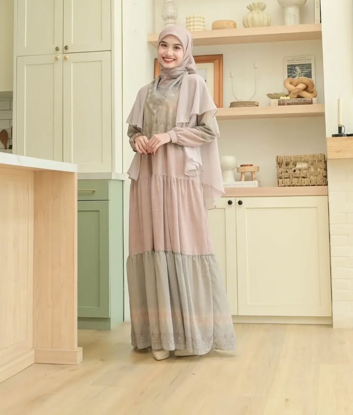 * Dress semi-Abaya aksen potongan dada & layer panjang 110 cm.